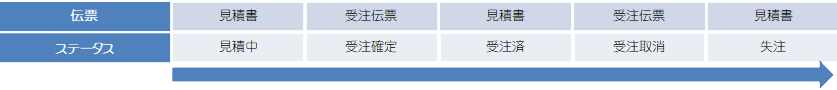 受注確定/売上計上/失注/売上取消/仕入計上/仕入取消等、ステータス変遷が自動設定されます。