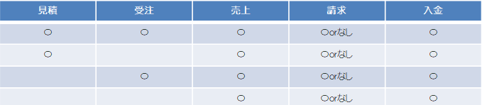 見積⇒受注⇒売上⇒請求⇒入金/受注⇒売上⇒請求⇒入金/売上⇒請求⇒入金/売上(現金)⇒入金